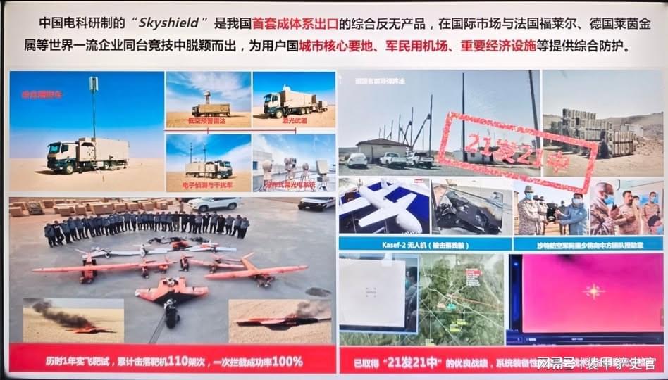 而在此前的7月,网络爆出的一张会议现场的简报图显示中电科出口沙特的“Skyshield”(天穹)激光反无人机系统,在一次实战中创下了21发21中的拦截纪录。该系统成功击落了胡塞武装发射的全部21架“卡赛夫-2K”型无人机,拦截率达到100%。这不仅刷新了世界激光武器实战纪录,也标志着中国在反无人机激光武器领域的技术已步入世界第一梯队,同时也很可能拿到了全世界最早的激光反无人机实战战果。
